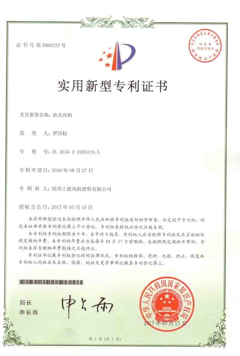 防火風機專利證書