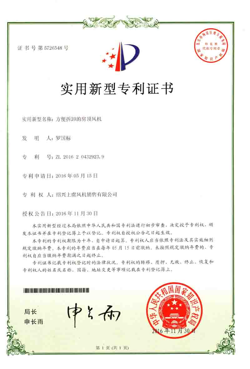 方便拆卸的房頂風機專利證書