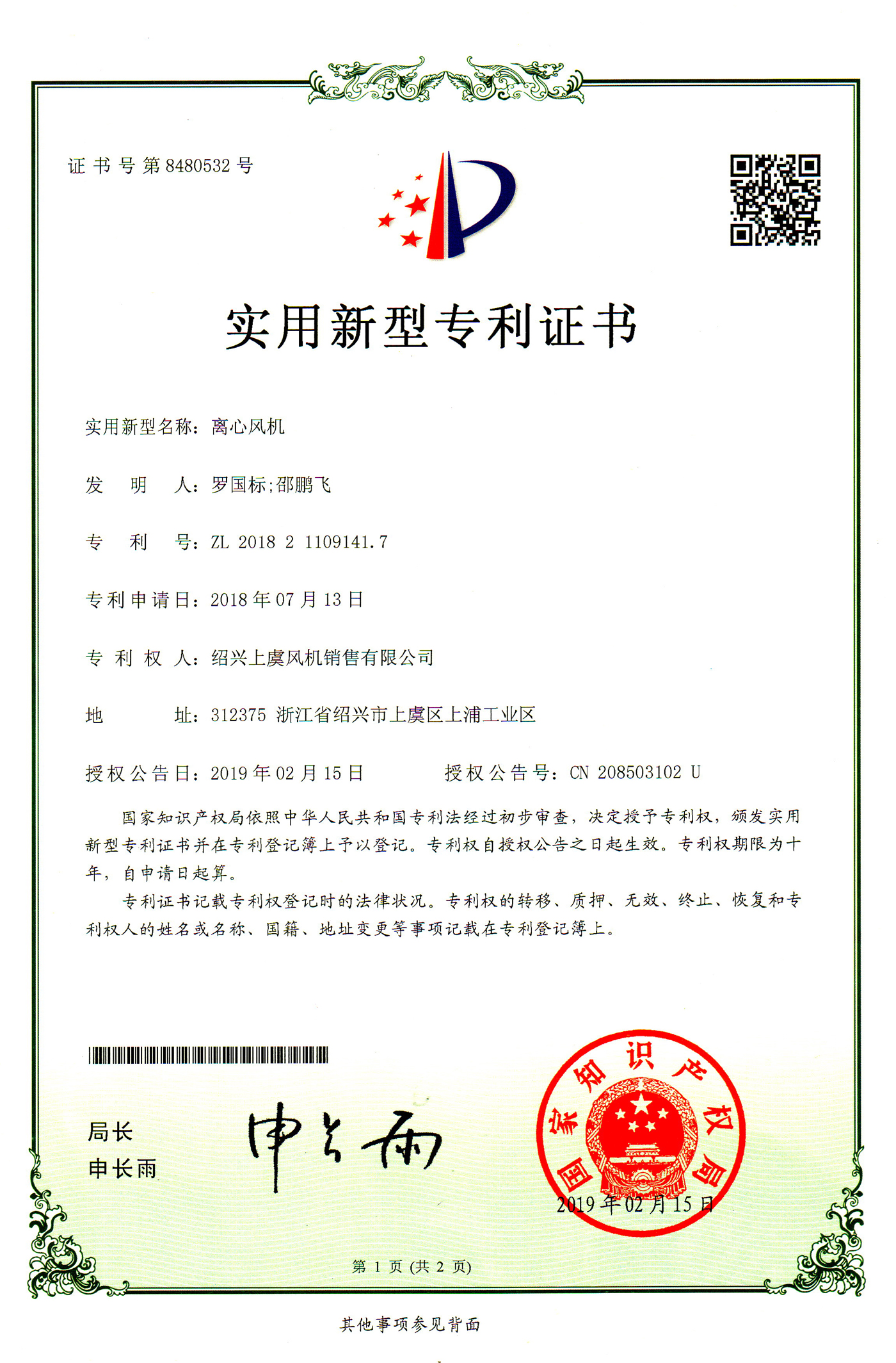 離心風機專利證書