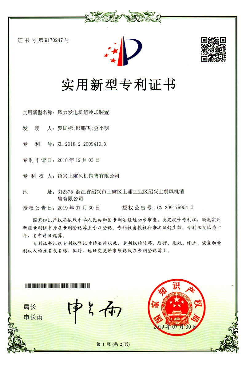 風力發電機足冷卻裝置專利證書