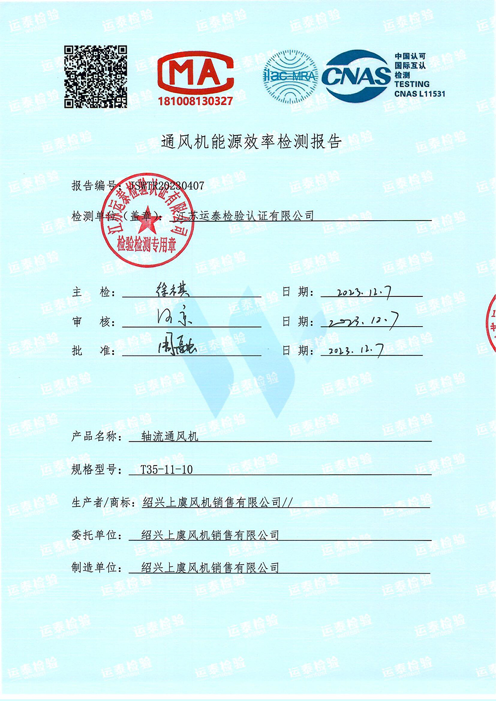 | 低噪聲軸流風機T35-11能效檢測報告 |